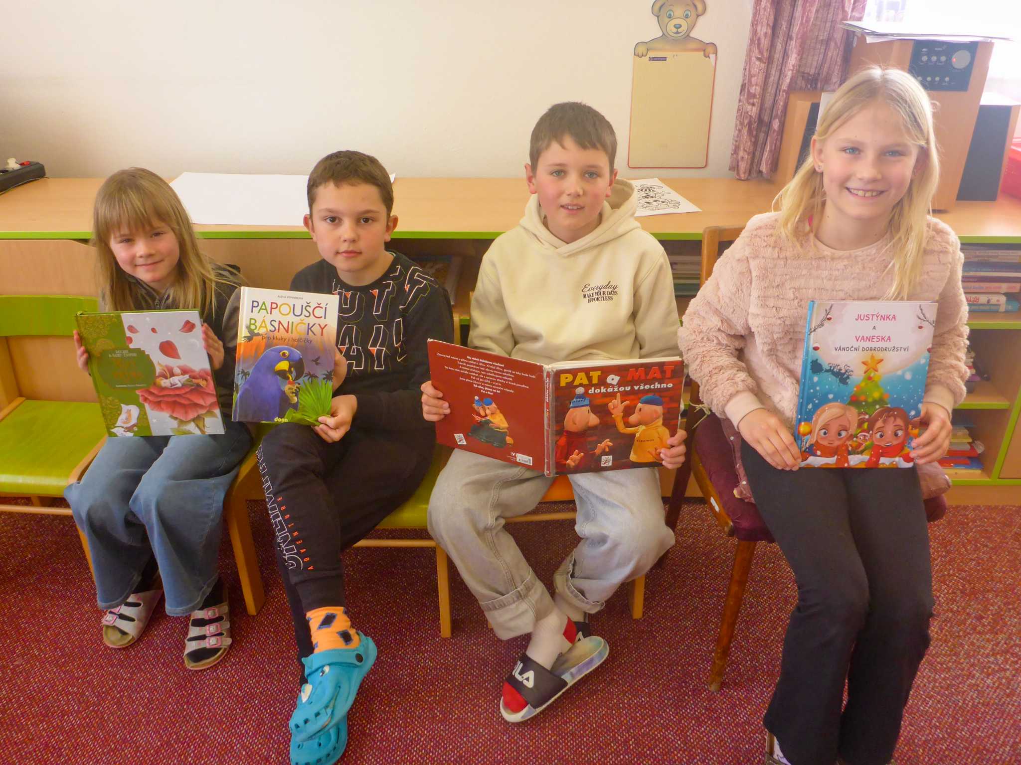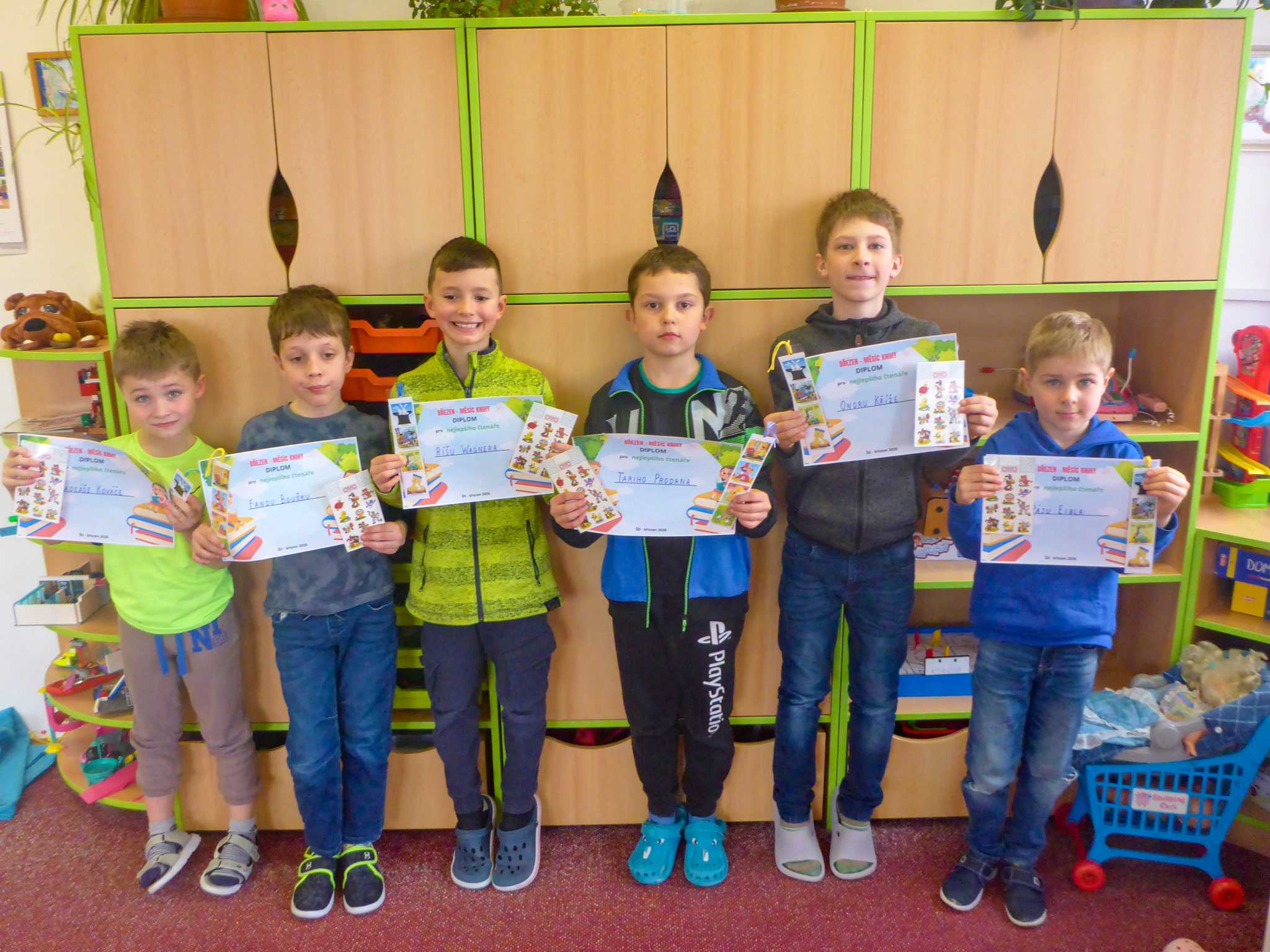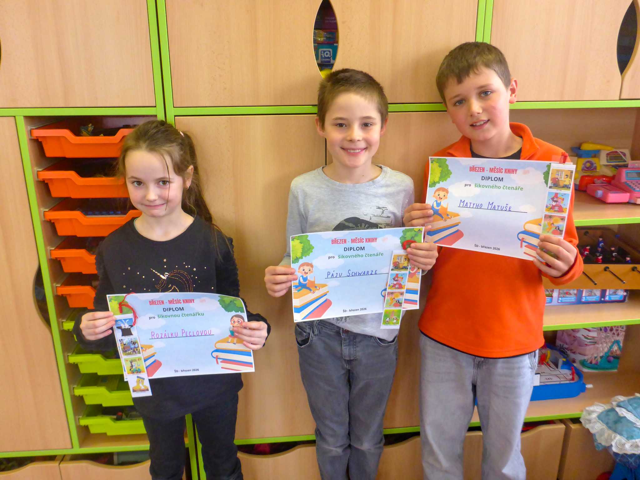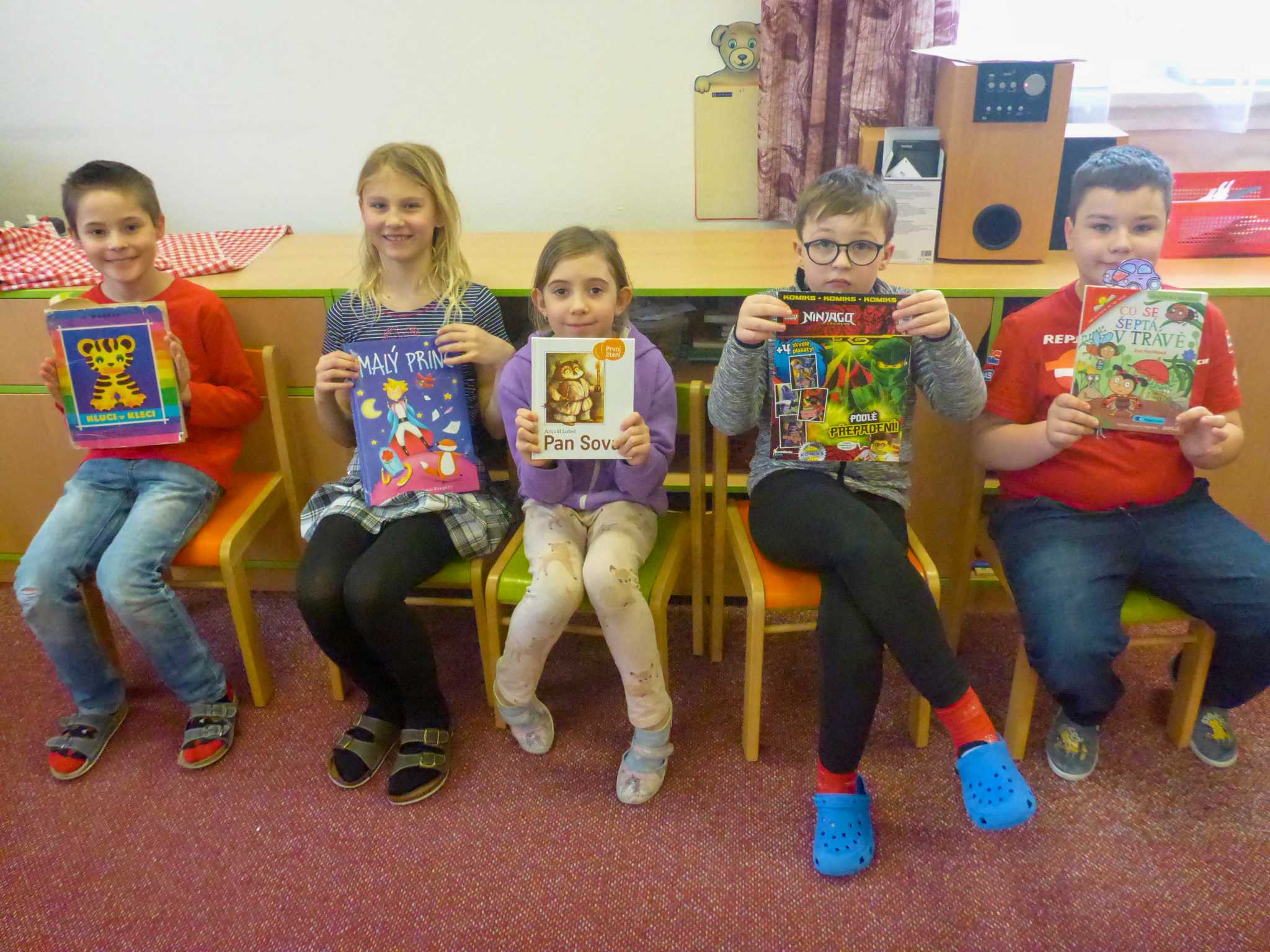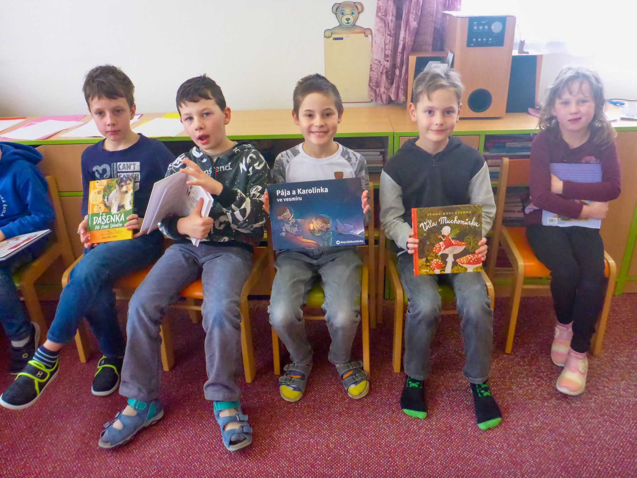 Po celý březen, jak je už zvykem, nás provázely knihy z našich domácích knihovniček. Téměř každý si odprezentoval nějakou svoji oblíbenou knihu. Úspěšně se zapojili i šikovní prvňáčci. Za odměnu každý dostal Večerníčkovou záložku do knihy a nejšikovnější čtenáři si odnesli i diplom.