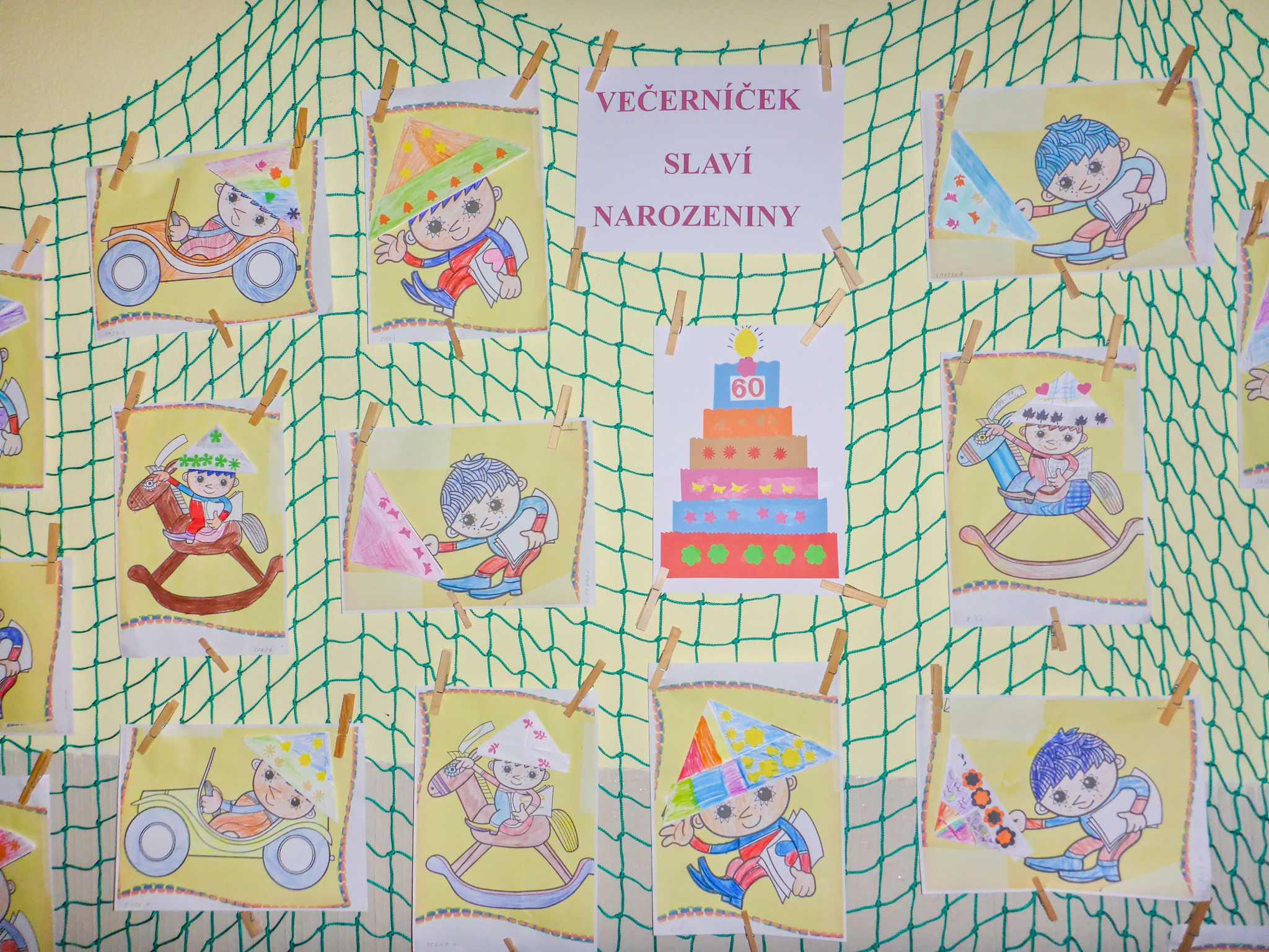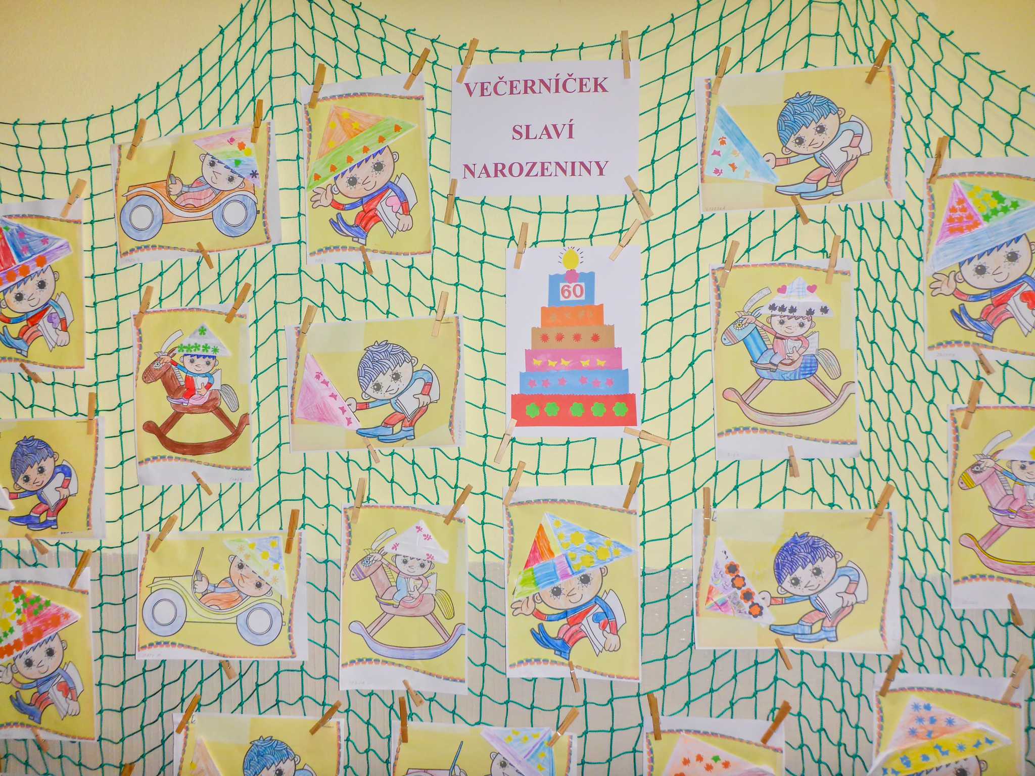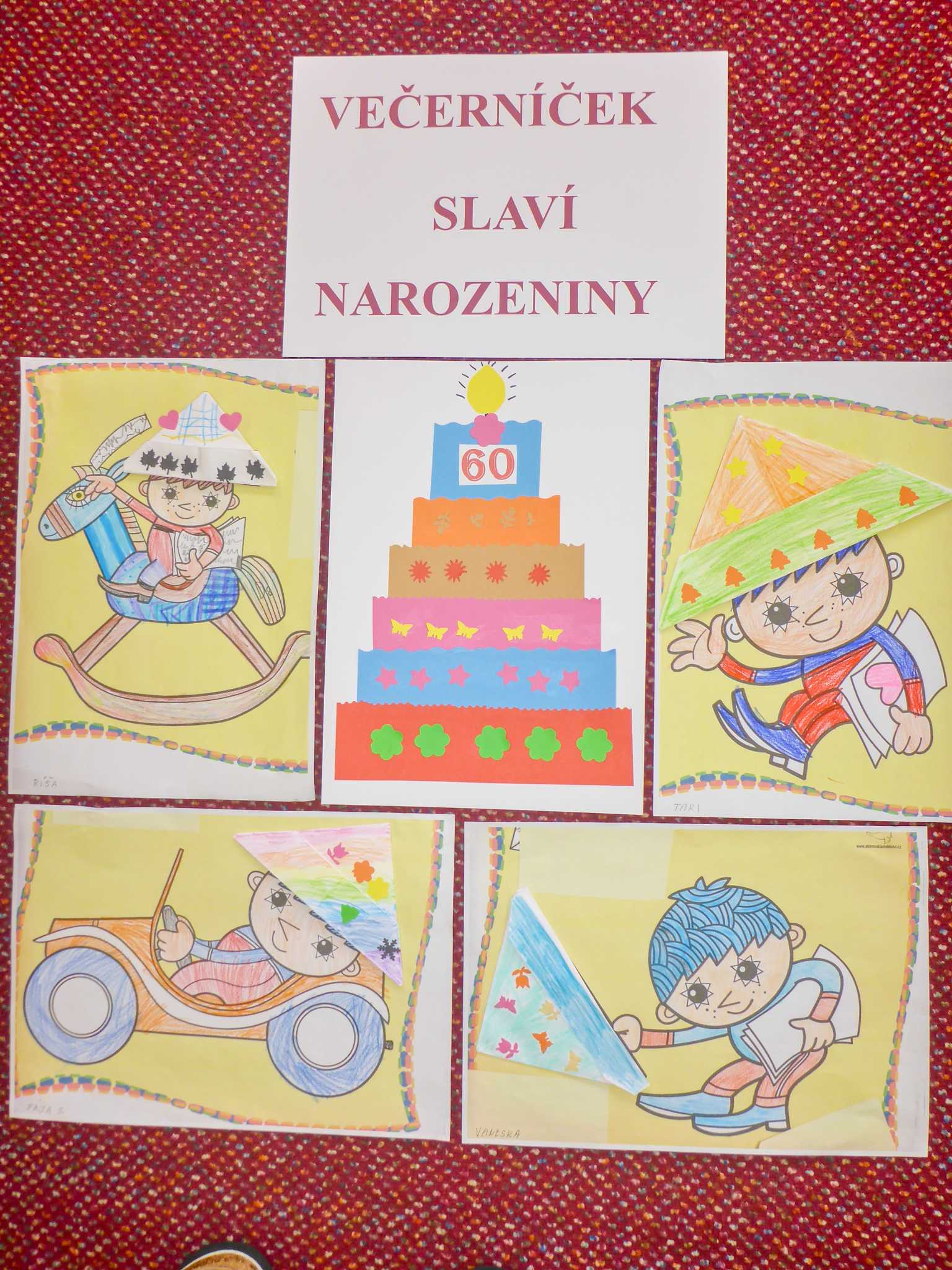 Celým rokem ve školní družině nás budou provázet Večerníčkové postavičky a jejich příběhy. Večerníček totiž letos slaví 60. narozeniny, proto jsme mu vytvořili z papíru narozeninový dort a veselou čepičku. Poslechli jsme si TV pořad o tom, jak se Večerníček narodil a jak vypadaly jeho první pohádky. Za odměnu každý dostal Večerníčkovou záložku do knihy.