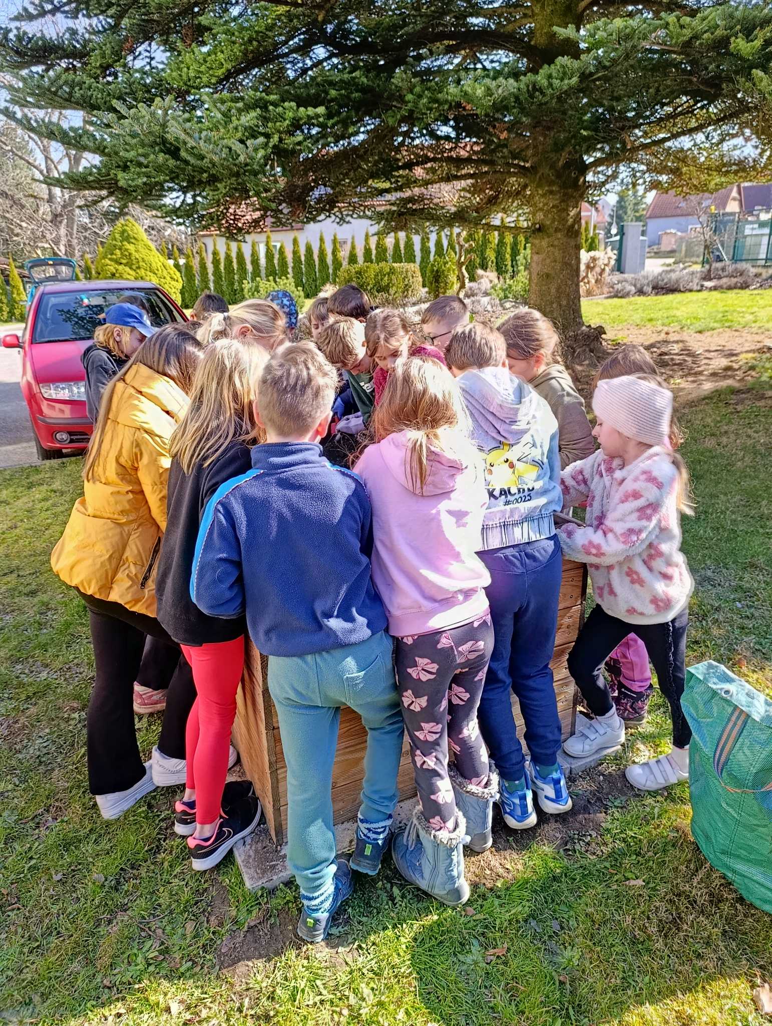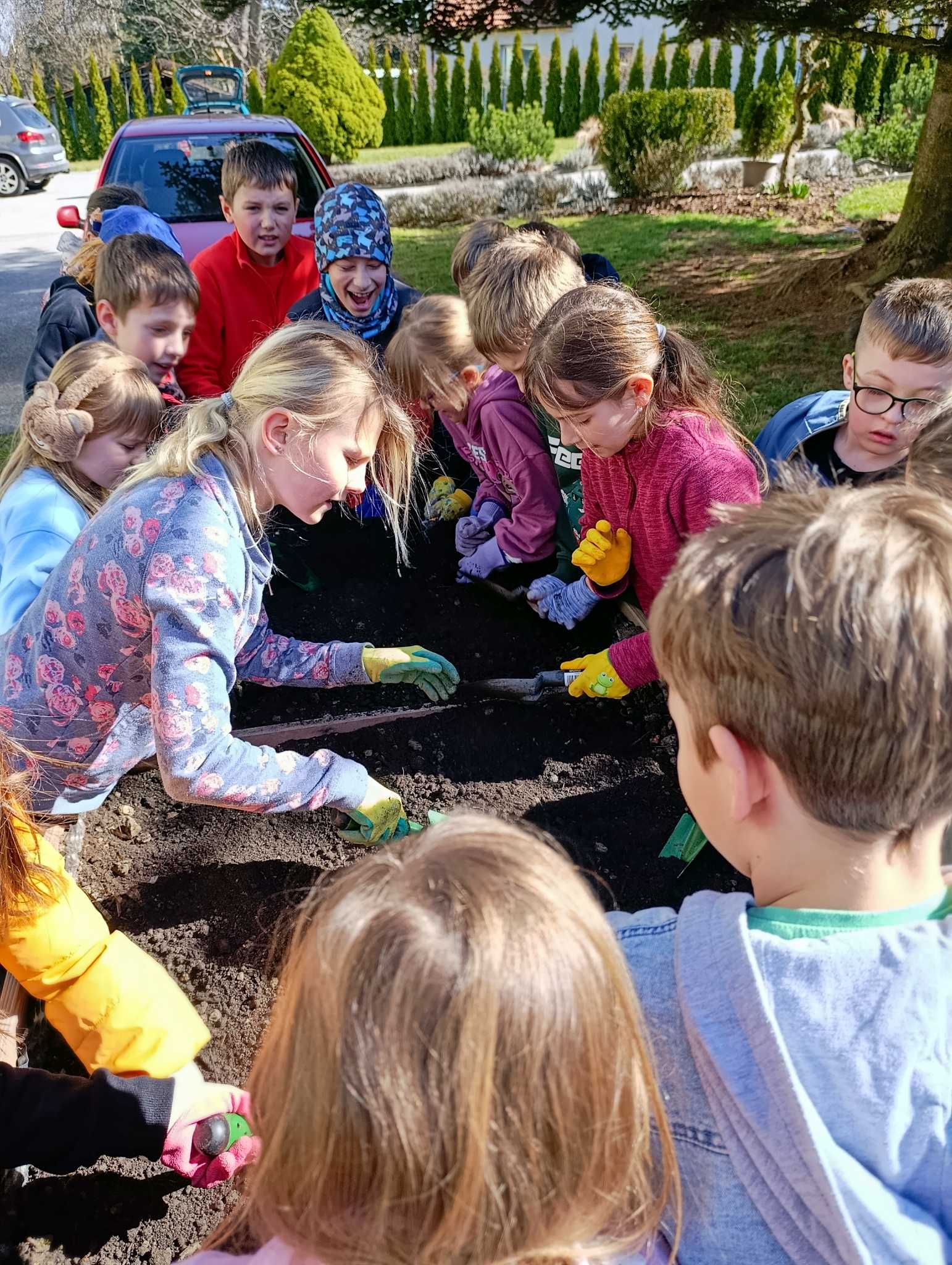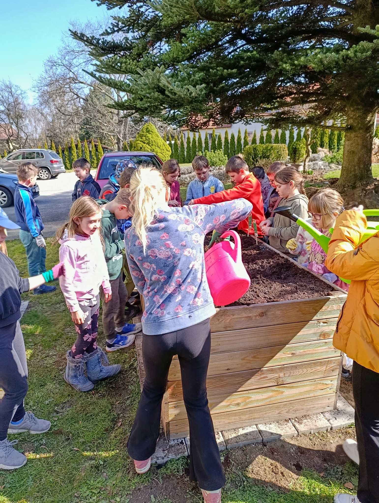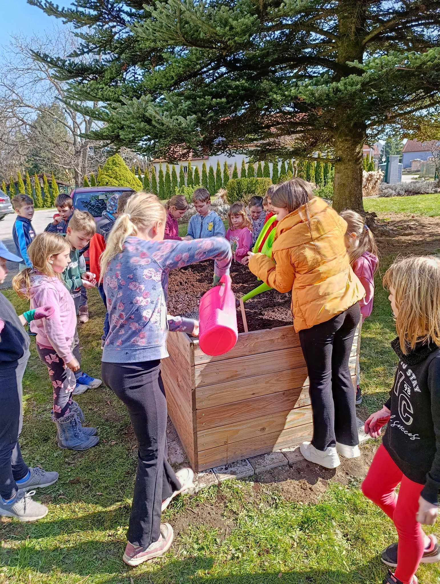 Děti si do svého záhonu zasadily ředkvičky, hrášek a mrkev, teď se o ně budou starat.